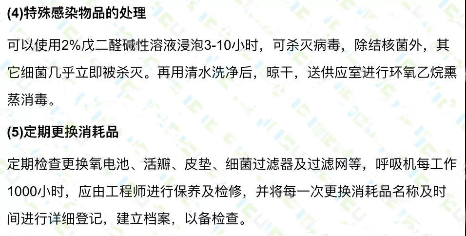 呼吸機的消毒應(yīng)遵循先徹底清洗,尤其是接觸患者的呼出氣體的部分,如管道、加溫濕化器和呼氣閥等(部分呼吸機帶細菌過濾器),可先用清洗劑沖洗,將其中的分泌物,痰痂等徹底清除,然后再消毒。消毒后經(jīng)蒸餾水沖洗晾干備用。經(jīng)化學消毒劑消毒后的呼吸機管路應(yīng)用蒸餾水清洗,而不建議用自來水,以免造成不必要的污染。